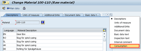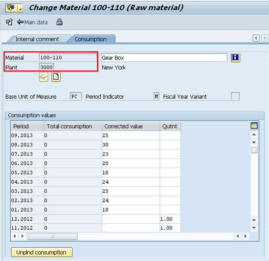 Whenever you create a new material in the system, the system automatically incorporates the Consumption tab in the Additional Data of the material master. While each withdrawal or consumption updates the information in the system, you can also manually enter past consumption figures of a material to help drive and facilitate forecasting.