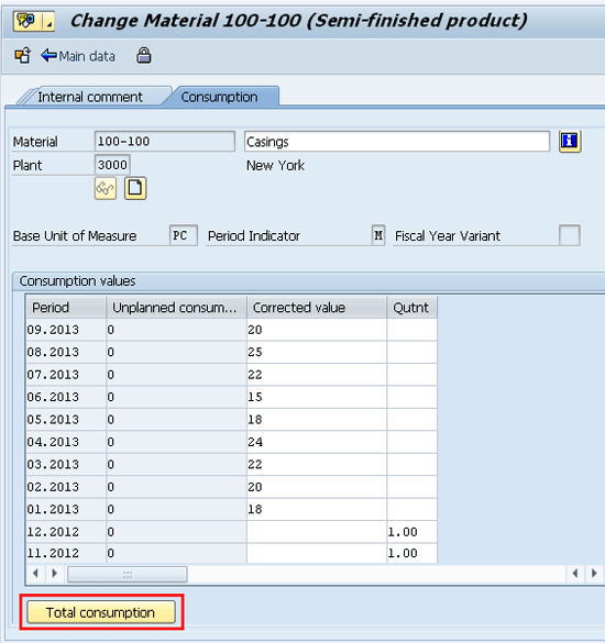 Here, I manually enter the monthly consumption data for nine months. If needed, you can always manually enter the consumption data. This option is useful when you are implementing an SAP ERP system for the first time and you’d like to record historical consumption values of a material to be able to immediately start taking advantage of the forecasting tool that the system offers. Click the Total consumption button in Figure 5, which takes you to the screen shown in Figure 6.
