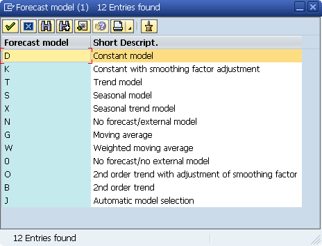 Place the cursor in the Forecast model field and press F4 (or click on the dropdown) in Figure 7. The system opens a popup screen to select from one of many forecast models (Figure 8).