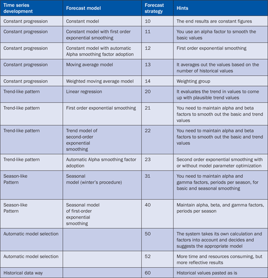 Table 1 shows the logical link between various forecast models, such as trends or seasonal trends, and the use of smoothing factors. For each forecast strategy (or model) selection, you will have to give details of the parameters, such as Alpha factor, Beta factor, or Gamma factor. This is highlighted in the Hints column of the table. For example, if the demand of a product is generally constant throughout the year, then you should select the constant model. Similarly, if you wish to maintain an average quantity of material in the warehouse, then you should use the moving average model. In moving average, the system adds up the total quantity of the material from historical figures and then divides this total quantity with the period under consideration to arrive at an average number.