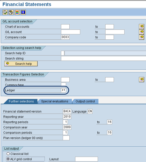 Step 6. Run the balance sheet/profit and loss account. Use transaction F.01/RFBILA000 to run this account (Figure 10). With the SAP General Ledger active, you find an option for Ledger on the selection screen of the financial statements report. Because you have set up a new rollup ledger and updated the data, you can call up the ledger from the selection screen.