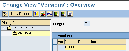 Step 1. Define the rollup ledger. Follow menu path Financial Accounting (New) > General Ledger Accounting (New) > Periodic Processing > Rollup > Define Rollup Ledger in General Ledger Accounting (Figure 1). Define a new ledger (in this example, X1) with the Totals Table as FAGLFLEXT. The system creates a new version, 1, for actual data (Figure 2). If there is plan data with different planning scenarios, you need multiple versions.