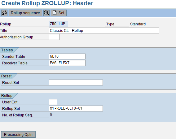The rollup sequence allows you to perform several rollup actions without having to create and execute separate rollups. This is relevant if data is rolled up from more than one source ledger in the sequence defined here. Since I’m using only one source ledger, I leave the relevant fields blank.