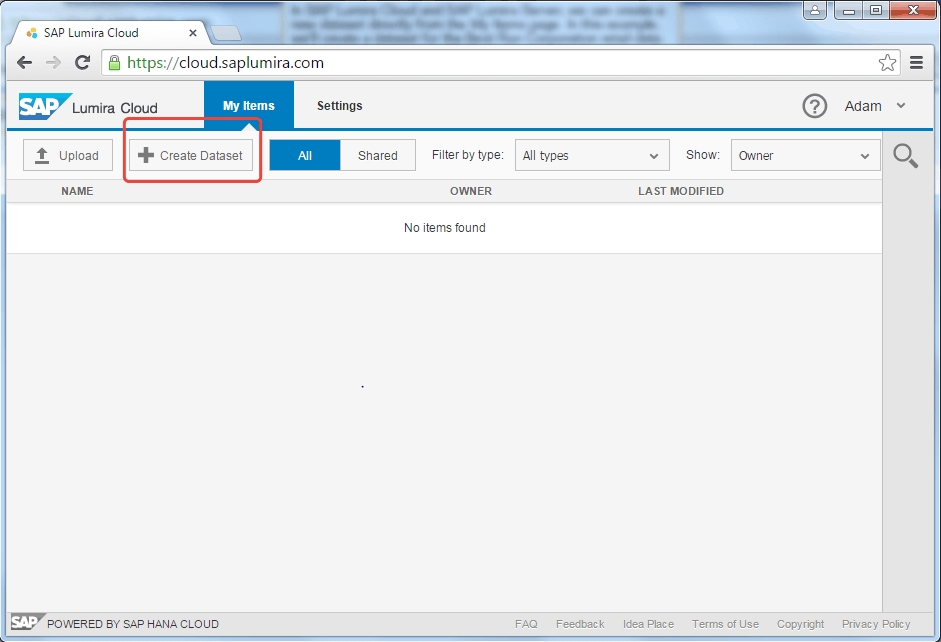 The first step in acquiring data is to log on to SAP Lumira Cloud and click the Create Dataset button (Figure 1). (SAP Lumira can be found on the Internet at: https://cloud.saplumira.com.)