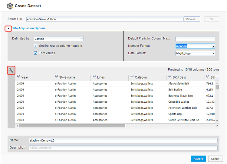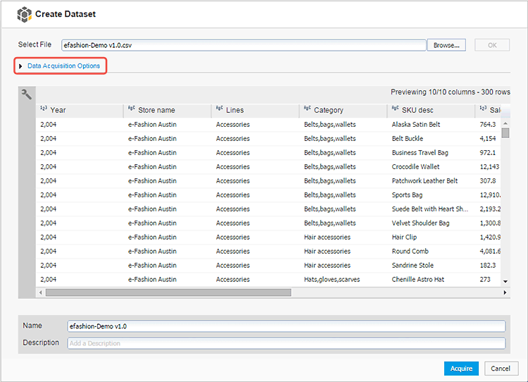 Then, back in the Create Dataset window, click the Acquire button (Figure 10) to complete the creation of the dataset. However, it is important to note that datasets created in SAP Lumira Cloud cannot be edited after being acquired, so click Acquire only when you are certain the dataset has all the correct properties.