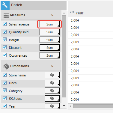 To open the default aggregation for the respective measure field, double-click any box next to any Measures field that has the word Sum in it (as shown in Figure 7).