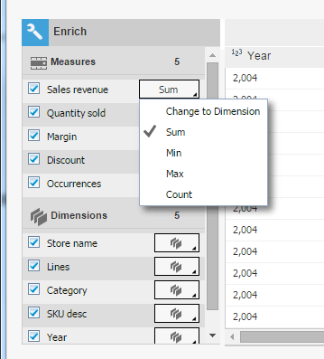 The Measures’ default aggregations that can be selected include: Sum, Min, Max, and Count (Figure 8). In addition, a measure field can be changed to a dimension field by clicking the Change to Dimension option on the context menu.