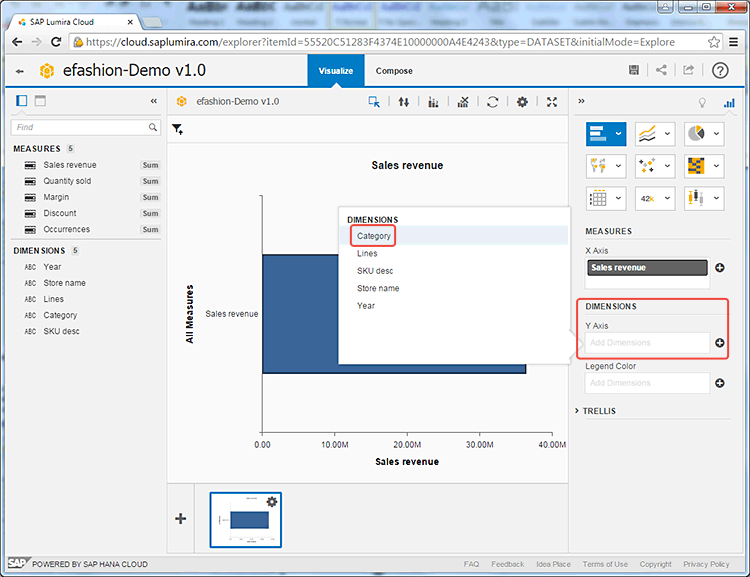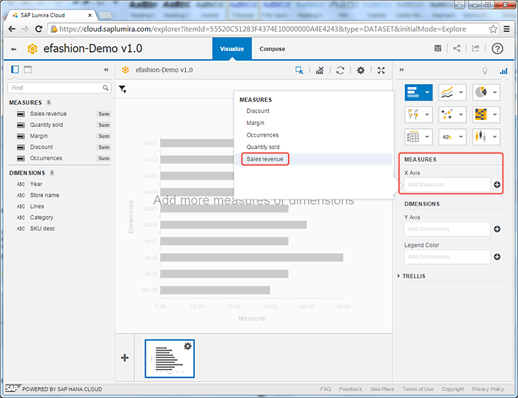 next to the X-Axis measure and select a measure to add to the visualization (Figure 15). In this case, Sales revenue is the measure selected.