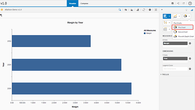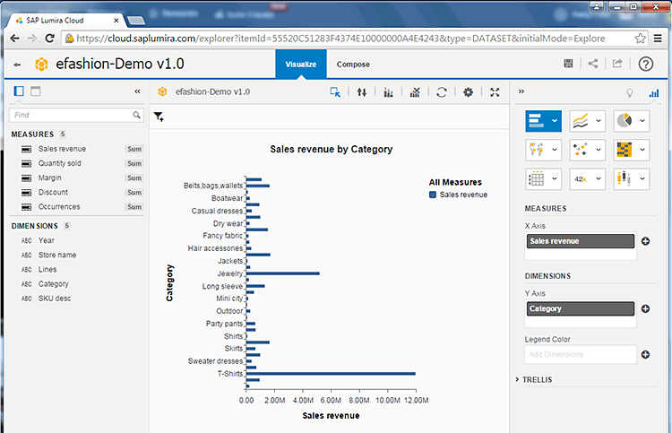 Using the dataset efashion-Demo v1.0 that was just created, I next show how to create a basic visualization. Included in this demonstration is a visualization of sales revenue by category. In addition, the creation of the visualization is demonstrated in three different ways: