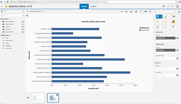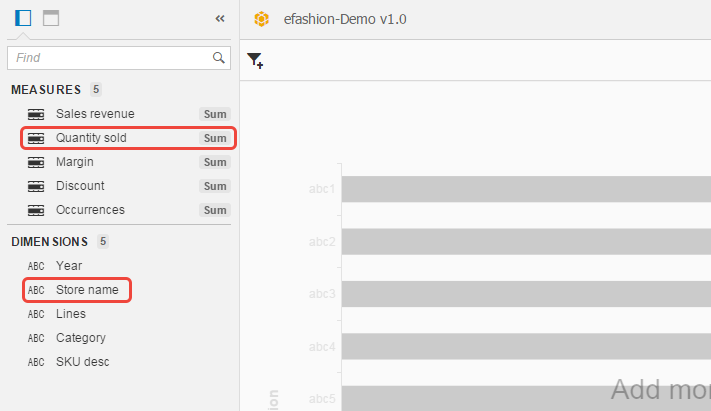 Another way to create a chart that is similar to the one created above is to double-click the relevant MEASURES and DIMENSIONS from the list of fields on the left side of the visualization as shown in Figure 19. In this case, double-click the Quantity sold measure and Store name dimension.
