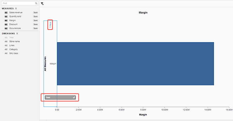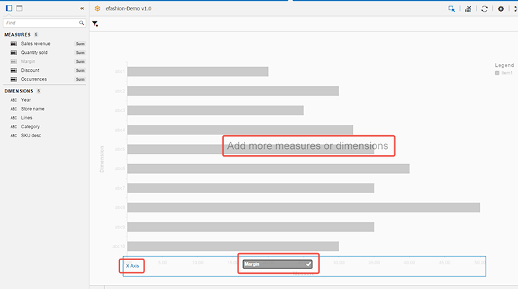 Measures can be dragged either to the area labeled Add more measures and dimensions or to the X-Axis area, as shown in Figure 21. In this case the field Margin is being dragged and dropped.