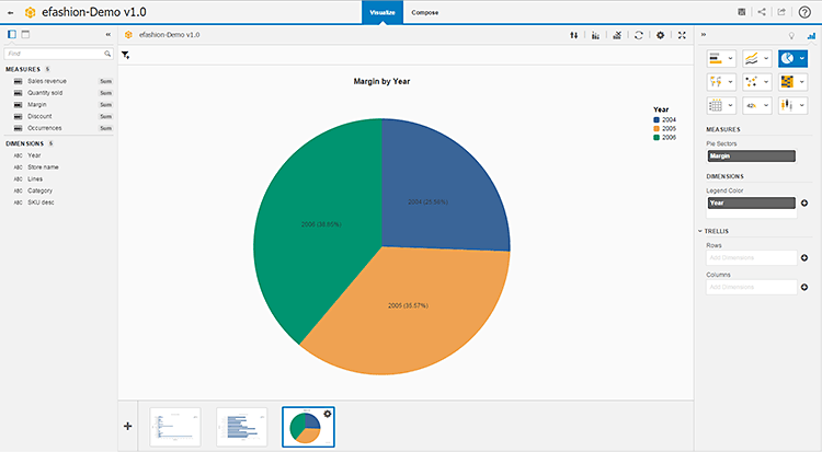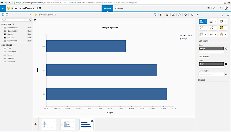 By dragging and dropping fields, the X-Axis is filled with a new measure (in this example, Margin), the Y-Axis is filled with a new dimension (in this case, Year), and a new chart is created. You can see the chart (with the new thumbnail at the bottom) in Figure 23.