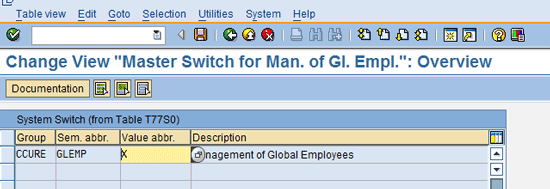 The Value abbr. column in the standard system is blank. Enter X (as shown) and click the save icon to save your changes and exit the screen. This activates the MGE functionality. By doing this, the related functionalities and infotypes are now made available to your system.