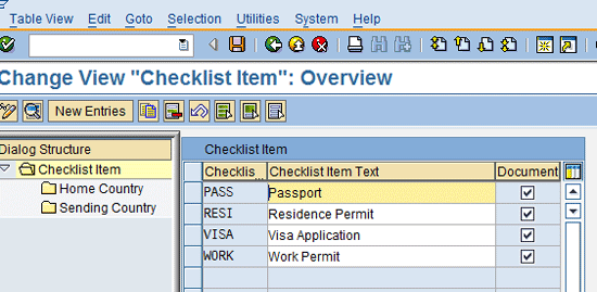 To create the required document type options, follow menu path SPRO > Personnel Management > Management of Global Employees > Assignment Preparation > Checklist Items and Documents > Define Checklist Items and Documents. Click the execute icon, which opens the screen in Figure 4.