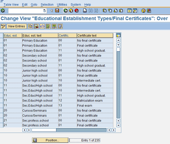 Follow menu path SPRO > Management of Global Employees > Assignment of Master data > Define School types, and click the execute icon. The screen in Figure 7 opens, which lists all of the school type entries available in the standard SAP ERP HCM system.