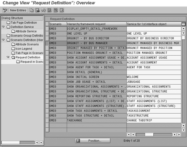As shown in Figure 5, you need to search for a hierarchy framework request that is similar to the view you want to display. In my example, I chose the delivered hierarchy request ORGUNIT MANAGED BY POSITION + DETAIL and copied it by clicking the copy button. I then changed the entries to my custom services for the interface object ORGUNIT MANAGED BY BUS MGR highlighted in Figure 5.