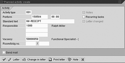 The easiest way to check your result is to create an individual letter for an applicant. (Before doing this, make sure that your user name is assigned to a personnel number via infotype 0105 and that the field initials in infotype 0002 are filled for this personnel number.) Follow these steps: