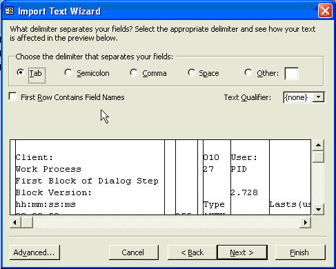 Because you saved the SAP file earlier as .TXT in a spreadsheet format, the file is now tab delimited. To continue, select the delimiter type as Tab and click on the Next button (Figure 10).