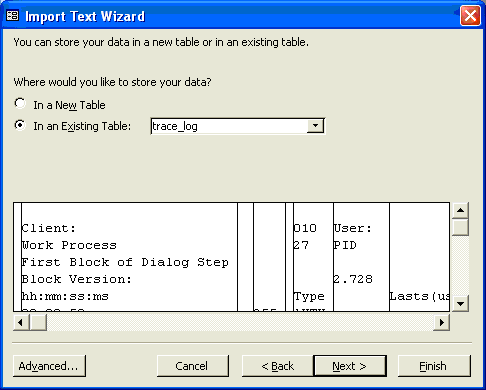 Then choose the In an Existing Table radio button and select trace_log from the drop-down box to store your imported data in the existing trace_log table (Figure 11). Finally, click on the Finish button and click on OK in the resulting message.