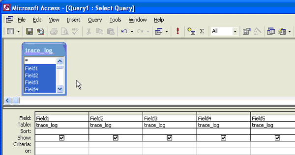 Add the trace_log table to the query by clicking on the Add button and close the pop-up box. Select all the fields from the table by holding the Ctrl key while clicking on the columns and drag all the fields to the section below so it fills the column names in the lower half of the query screen (Figure 14).