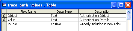 The Object and Value fields should be of Text type and 255 characters in length for each (Figure 16). The InRole field should be of data type Yes/No because you use this to keep track of the values you have inserted into the new role. Highlight the Object and Value fields and select Edit > Primary from the user menu to make columns Object and Value the primary key. This constraint ensures that you do not get duplicate entries in the new table. Save the table as trace_auth_values and exit from table maintenance.