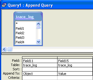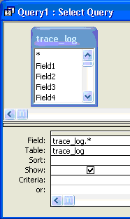 Now you need an append query that can read the trace_log table and move the entries to the new trace_auth_values table. From the query area, create a new query from design view. Choose the trace_log table and add it as the source into the new query by clicking on the Add button.