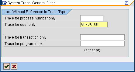 In the pop-up screen that appears, enter the desired user to trace (e.g., WF-BATCH) and click on the Continue button (Figure 2). Then click on the Trace on button in Figure 1 to activate the trace.