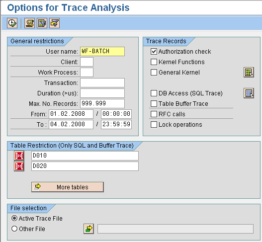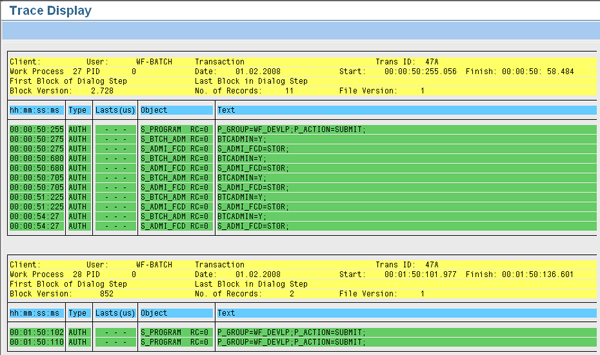 Normally, the most effective way to build a role is to gather the requirements up front with the company and spend most of the time planning the required transactions and activities. However, this is not always possible in a productive environment in which batch users have been in the system for years. The most effective way to gather data for such complex users is to allow the user to run with excessive access that it already has and trace its activities. Because you probably use WF-BATCH in your production system and most likely with SAP_ALL, you can easily subject WF-BATCH to an authorization trace.