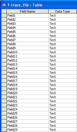 Then create 29 column fields (Figure 7). Twenty-nine fields is sufficient to contain all fields that might be in the file. These should be a standard Text type of 255 characters each. The column names in this table are not important. When you upload the tab-delimited file, each tabbed field is parsed into a new field in the database table. Save this table name as trace_log (Figure 8).