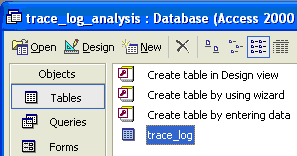 The first step in the data mining process is to create a new Microsoft Access database called trace_log_analysis.mdb. If you are familiar with another database vendor, then you may use that specific product. In the new and empty database, choose Create table in Design view (Figure 6).