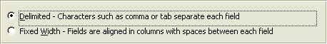 Now import your downloaded trace log file into the new database table. To do this from Microsoft Access, follow menu path File > Get External Data > Import. Choose the directory and file (e.g., full_trace_file.TXT) that you want to import and click on the Import button. If you don’t see your file, change the Files of type to Text Files. After you click on the Import button, choose the Delimited option even though Microsoft Access recommends Fixed Width (Figure 9). Then click on the Next button.