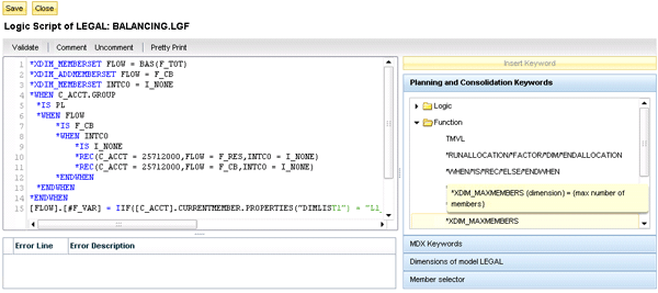 The Script Logic Editor is a new feature in SAP BusinessObjects Planning and Consolidation 10.0, version for SAP NetWeaver that increases flexibility for developers who need to adjust script code or comment on it.