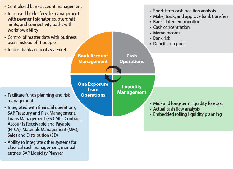Figure 1 shows the functionalities offered by SAP S/4HANA Finance for cash management.