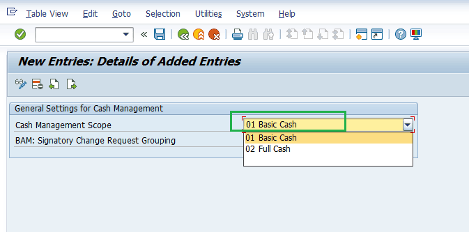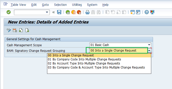 In Figure 3, the other setting, BAM: Signatory Change Request Grouping, is applicable for bank account management. It is used to define how many change approval workflows are generated if payment signatories are changed on bank accounts. For my example, you are activating basic cash management, so you select the 00 Into a Single Change Request option from the drop-down list shown in Figure 4.