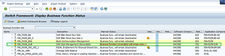 Figure 5, the business function is already activated.) After FIN_FSCM_CLM is activated, the cash management component in your system is enabled. This activation is indicated by the following message: Business func. (Reversible) will remain activated. This is a reversible business function, so if at any point you do not want to use the SAP S/4HANA Finance for cash management features, then this can be de-implemented.