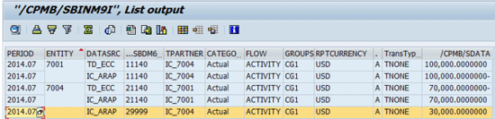 Figure 3 shows you the back-end BW data generated by the solution. (You can use transaction Listcube or Display data from the right click menu over your BPC consolidation cube.) The example uses entity 7001, which holds A/R balance $100,000 with trading partner 7004. Entity 7004 has A/P 21140 balance -$ 70,000 with trading partner 7001.