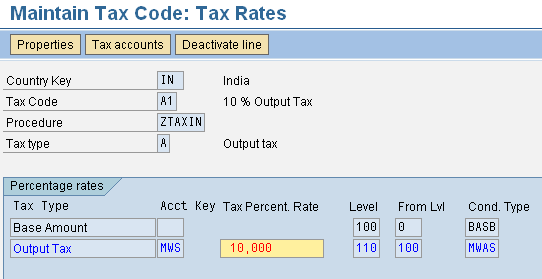 Having assigned the tax procedure to a country, you define tax codes. Tax codes help in determining the tax rate for a given combination of tax category and country.