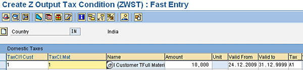Finally, you need to maintain a condition record for ZWST via transaction code VK11. Set the customer tax classification (field TaxCL1Cust) to 1 (full customer tax). Set the material tax classification (field TaxCl.Mat) to 1 (full material tax). Set the tax code (field Tax…) to A1 (defined above), as shown in Figure 13. The condition value has been directly picked up from the value you maintained in Figure 12 for tax code A1 (10%).