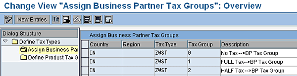 Now select the entry you just edited (IN + ZWST) and double-click the Assign BP Tax Groups folder in the left pane of Figure 14. Make three entries as shown in Figure 15 corresponding to the customer tax classifications defined in Figure 6.