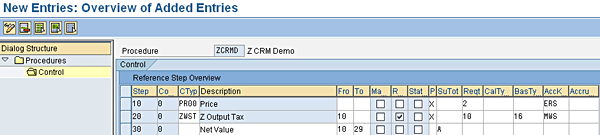 Select the entry, double-click the Control folder in the left pane of the screen, and add new condition types (in this case base price and tax conditions) to the procedure (Figure 4).