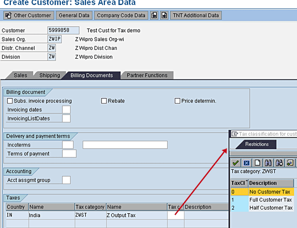 Because of the configuration done in the above steps, when creating a customer master entry in SAP ECC, you are now able to see the tax classifications reflected for an Indian (IN) customer. To do this, navigate to the customer master record using transaction code VD01. Click the Sales Area Data button, and the screen in Figure 7 appears. Under the Taxes section of the Billing Documents tab, you can find the tax categories and tax classifications defined for the customer master. Press the F4 key with the Tax Classification column selected to bring up the classifications you defined above.