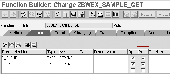 If the quantity of records in the master data table is small and you wish to display all the available records, then you do not need to create any import parameters. However, if you have many records in your master data table, you can create import parameters, using a standard select statement in the ZBWEX_SAMPLE_GET function module, to filter the records the system displays. In this case, I created two, I_PHONE and I_DNC, on the Import tab of the function module (Figure 1).