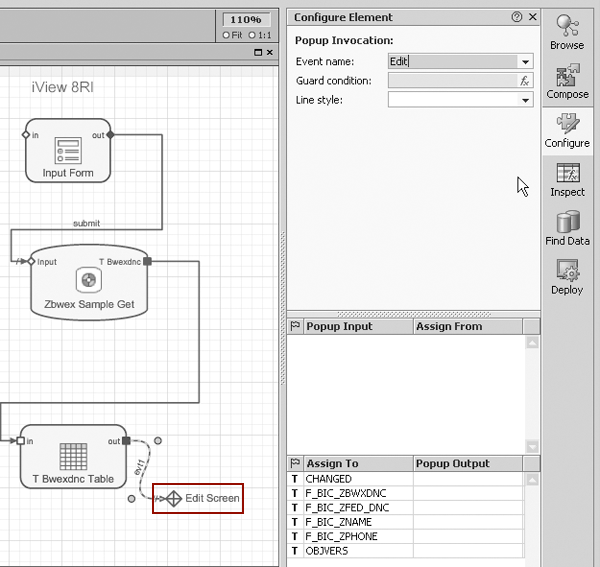 In the Select Pop-up iView screen that appears, select the Create new iView and give it the name Edit Screen. Click on the OK button. That takes you back to the main iView. Select the line that links the table to the pop-up screen and change the Event name in the Configure Element section so that it is the same as the name of your custom action, in this case Edit (Figure 11).