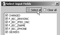 After you have selected the start point, the Select Input Fields screen appears (Figure 12). You can check all the check boxes individually or click on the Select all button at the top of the screen. The start point connector allows you to pass information between the first iView and the pop-up iView. In this case, I am passing one record at a time, so you could consider it a work area being based between screens.
