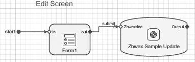Drag in ZBWEX_SAMPLE_UPDATE. Select and hold on the small circle beside the input (Zbwexdnc), drag it out, and let go. Select Start Point from the menu that appears. The input name should be the same as the table you defined in the update function module, in this case ZBWEXDNC.