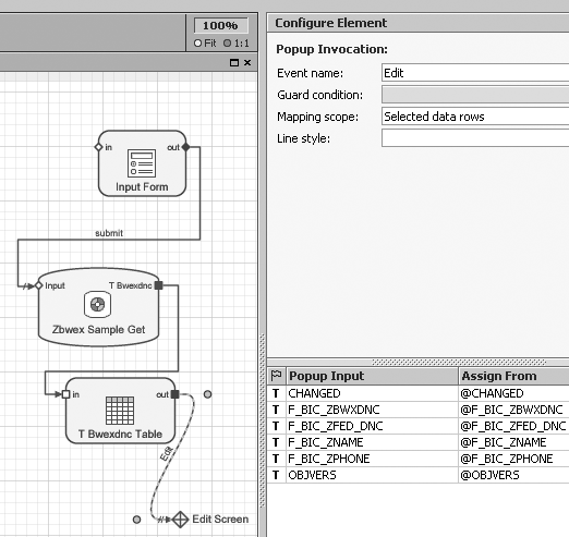 In this screen, the user can change the data and submit those changes to the update function module (ZBWEX_SAMPLE_ UPDATE). Select and hold the small circle to the right of out on the table, drag it out a small distance, and then let go. In the menu that appears, select Open Popup (Figure 10).