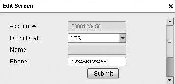 Select the record to modify, and then click on the Modify button. This triggers the “Edit” event you defined, which opens the pop-up iView shown in Figure 16. Use the drop- down menu in the Do not Call field to change the record, then click on the Submit button. When finished, click on the x icon to exit and save.