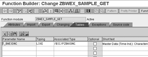 Step 2. Define the function module to display the master data (ZBWEX_SAMPLE_GET)