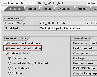 After you download the code, click on the Source code tab, and copy and paste in the code. Finally, set the function module to Remote-Enabled Module as you did in step 2 for the ZBWEX_SAMPLE_GET function module (Figure 3).