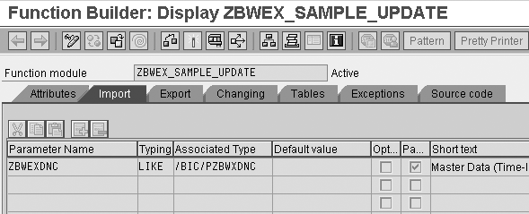 Step 3. Define the function module to update the master data (ZBWEX_SAMPLE_UPDATE)